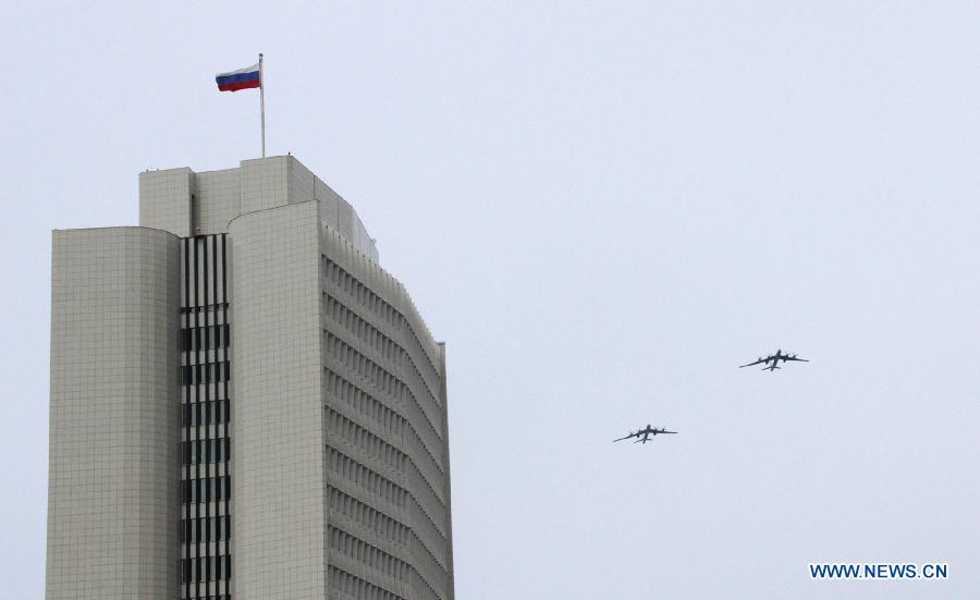 Russian military aircrafts are seen during the military parade marking the 70th anniversary of the victory in the Great Patriotic War, in Vladivostok, Russia, May 9, 2015. (Xinhua/Valery)