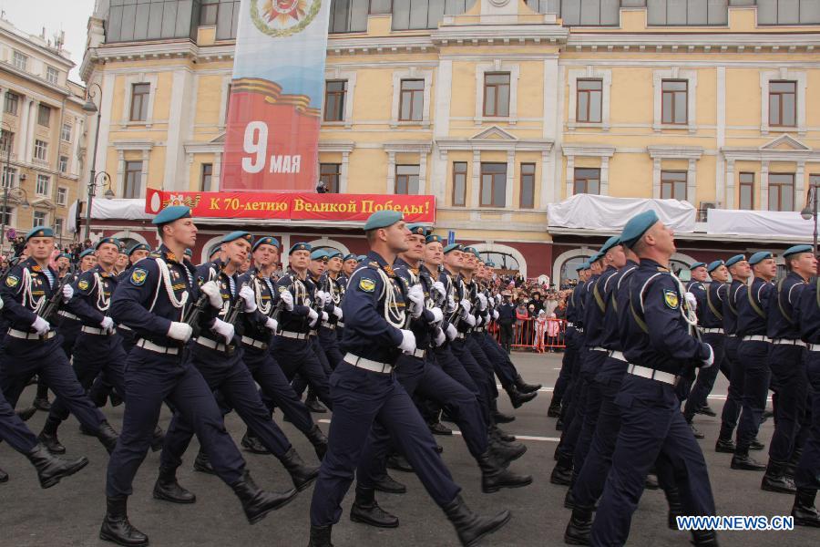 Russian soldiers take part in the military parade marking the 70th anniversary of the victory in the Great Patriotic War, in Vladivostok, Russia, May 9, 2015. (Xinhua/Alisa)
