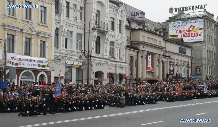 Russian soldiers pay silent tribute to martyrs during the military parade marking the 70th anniversary of the victory in the Great Patriotic War, in Vladivostok, Russia, May 9, 2015. (Xinhua/Zhu Yushu)