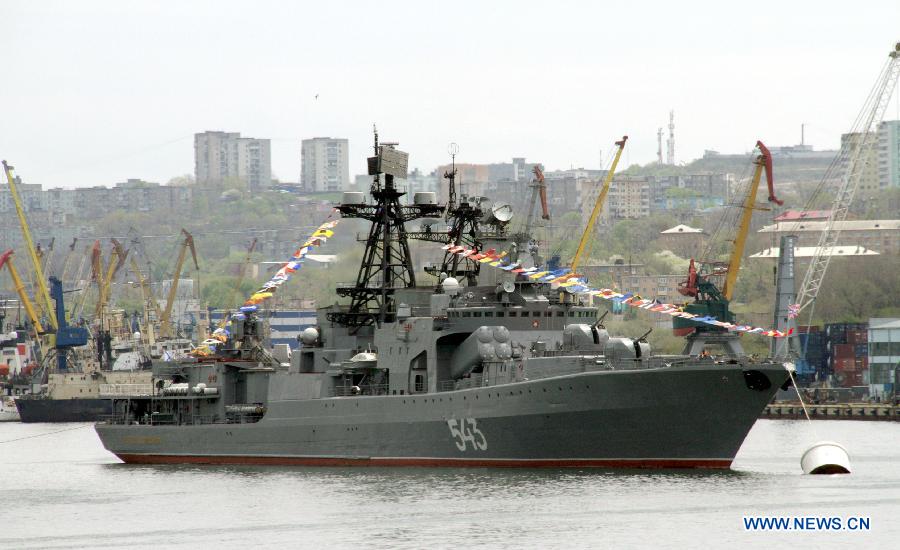 Warships of Russia's Pacific Fleet are seen during the military parade marking the 70th anniversary of the victory in the Great Patriotic War, in Vladivostok, Russia, May 9, 2015. (Xinhua/Valery)