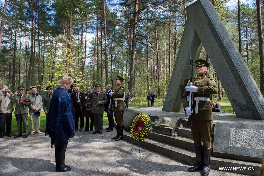 Lithuania's President Dalia Grybauskaite attends the commemoration marking the 70th anniversary of World War II victory in Europe in Vilnius, Lithuania, on May 8, 2015. (Xinhua/Alfredas Pliadis)