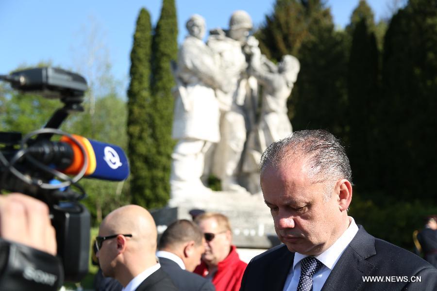 Slovak President Andrej Kiska attends a commemoration event of the 70th anniversary of World War II victory in Europe held in the Central Military Cemetery of Royal Romanian Amry and Red Army in Zvolen, central Slovakia, May 8, 2015. (Xinhua/Erik Adamson)