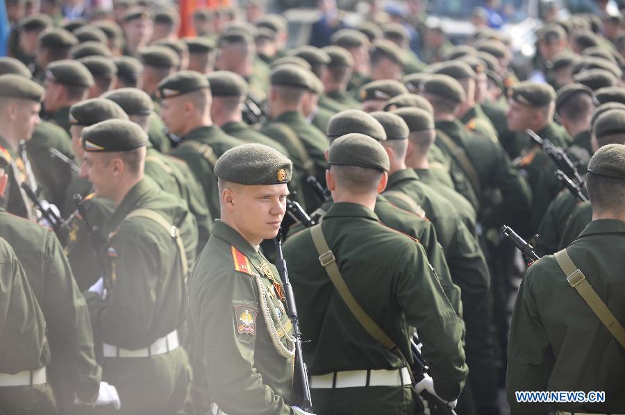 Soldiers wait before a military parade marking the 70th anniversary of the victory over Nazi Germany in the Great Patriotic War, at the Red Square in Moscow, Russia, May 9, 2015. (Xinhua/Jia Yuchen)