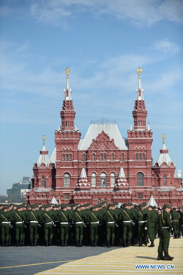 Soldiers arrive at the Red Square before a military parade marking the 70th anniversary of the victory over Nazi Germanyin the Great Patriotic War, in Moscow, Russia, May 9, 2015. (Xinhua/Jia Yuchen)