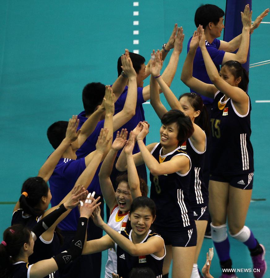 Players of China celebrate after winning a semifinal against South Korea at the 1st Asian U-23 Women's Volleyball Championship in Pasig City, the Philippines, May 8, 2015. China won 3-0. (Xinhua/Rouelle Umali)