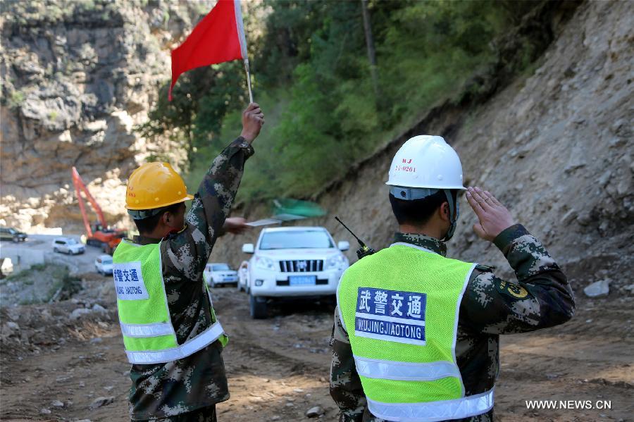 Vehicles run on the roadway linking Gyirong Town and Gyirong port in Xigaze City, southwest China's Tibet Autonomous Region, May 8, 2015. The traffic of this landslide-disrupted road was resumed on Friday after a 13-day rush repair. The region was severely hit by the April 25 Nepal earthquake. (Xinhua/Pi Feng)