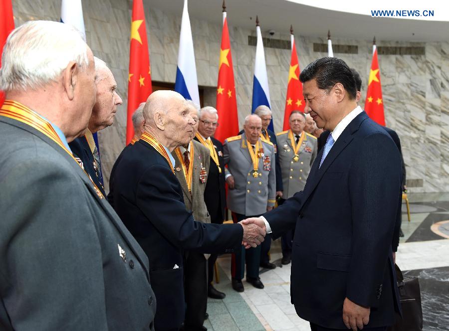 Chinese President Xi Jinping (R, front) shakes hands with a Russian veteran in Moscow, Russia, on May 8, 2015. Xi met with 18 representatives of Russian veterans who fought dauntlessly on the battlefield in northeast China during the anti-Japanese war and in Russia's Great Patriotic War in Moscow on Friday. (Xinhua/Rao Aimin)