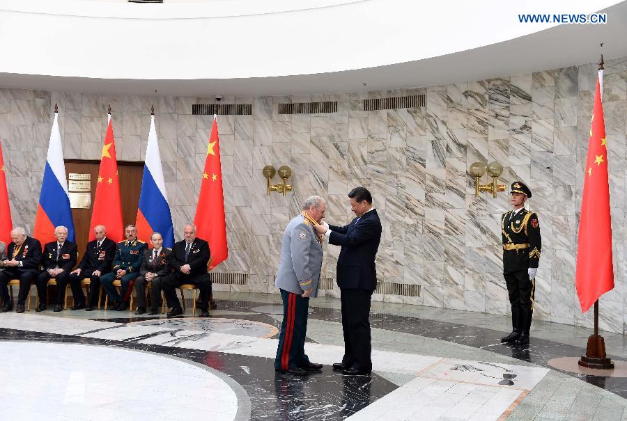 Chinese President Xi Jinping (2nd R) awards a medal to a Russian veteran in Moscow, Russia, on May 8, 2015. Xi met with 18 representatives of Russian veterans who fought dauntlessly on the battlefield in northeast China during the anti-Japanese war and in Russia's Great Patriotic War in Moscow on Friday. (Xinhua/Rao Aimin)