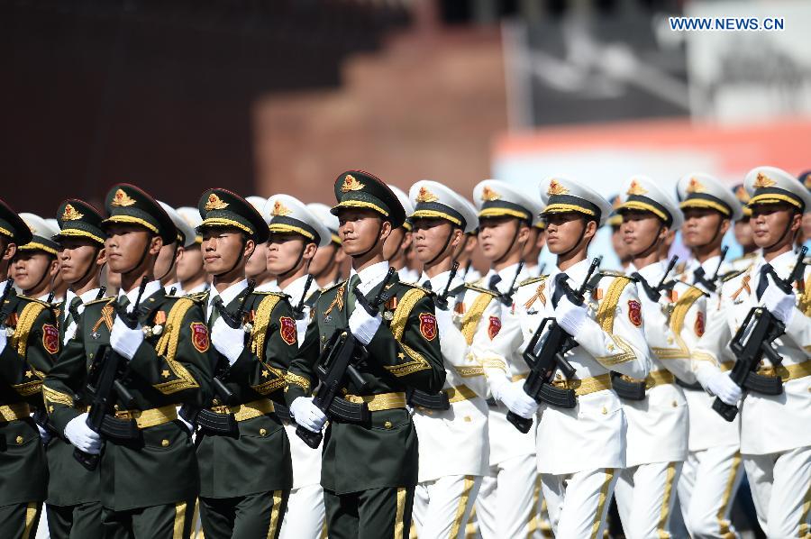 The guard of honor of the three services of the Chinese People's Liberation Army (PLA) take part in the military parade marking the 70th anniversary of the victory in the Great Patriotic War, in Moscow, Russia, May 9, 2015. (Xinhua/Jia Yuchen)