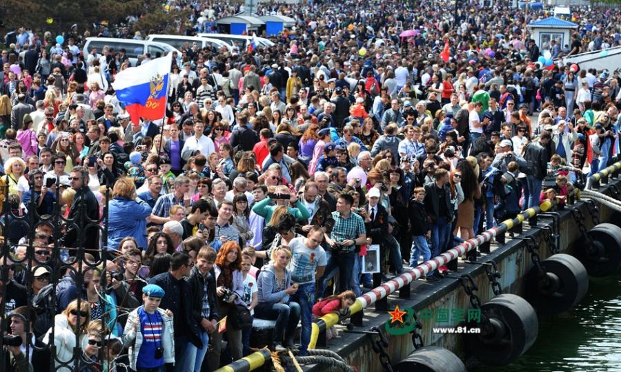 Visitors look at China’s missile frigate Linyi during an open day at the Novorossiysk naval base, Russia, May 9, 2015. More than 3,000 visitors and Russian navy officials boarded the ship over two days. The ship arrived for the celebration of the 70th anniversary of the Soviet victory over Nazi Germany in WWI and will leave Novorossiysk for the Mediterranean Sea, where naval drills with Russia, dubbed Joint Sea 2015, will take place. (Photo: China News Service/Li Jing)