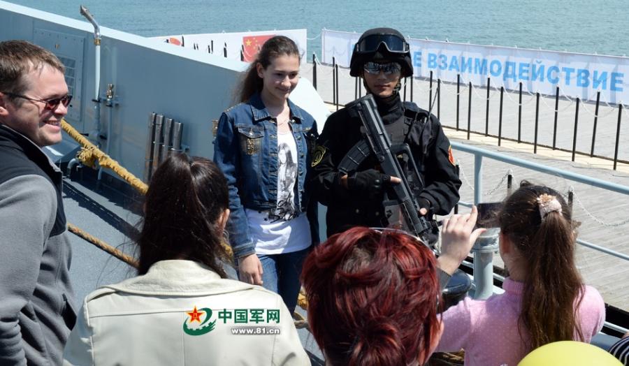 A Chinese navy official shows visitors around missile frigate Linyi during an open day at the Novorossiysk naval base, Russia, May 9, 2015. More than 3,000 visitors and Russian navy officials boarded the ship over two days. The ship arrived for the celebration of the 70th anniversary of the Soviet victory over Nazi Germany in WWI and will leave Novorossiysk for the Mediterranean Sea, where naval drills with Russia, dubbed Joint Sea 2015, will take place. (Photo: China News Service/Li Jing)