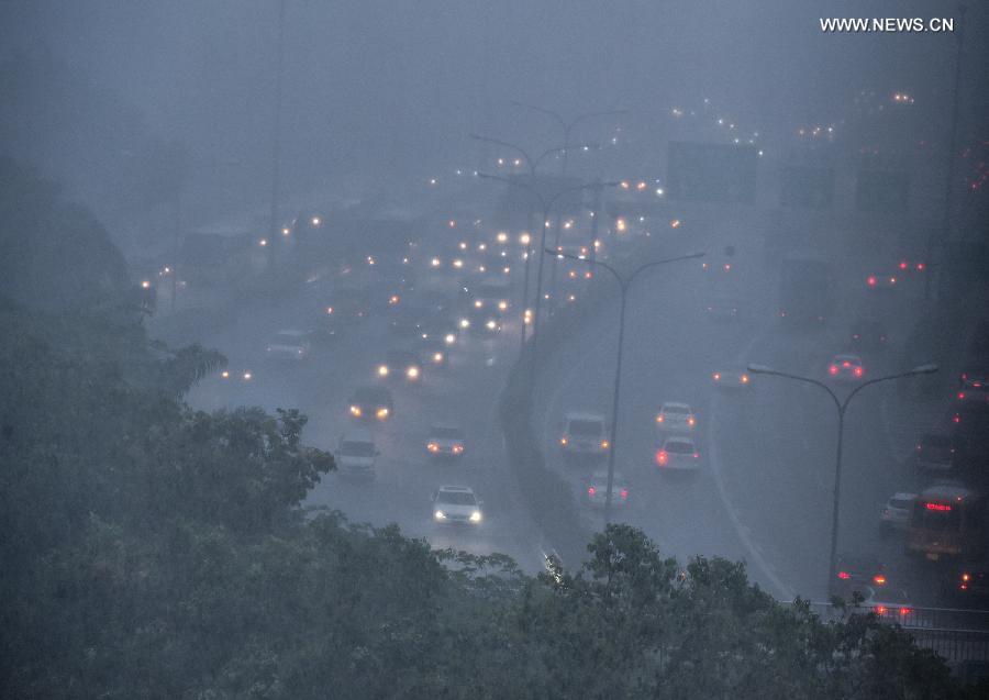 Vehicles move on a road during a rainstorm in Shenzhen, south China's Guangdong Province, May 11, 2015. A heavy rainstorm hit the city Monday. The local meteorological bureau issued red alert for rainstorms. (Xinhua/Mao Siqian)