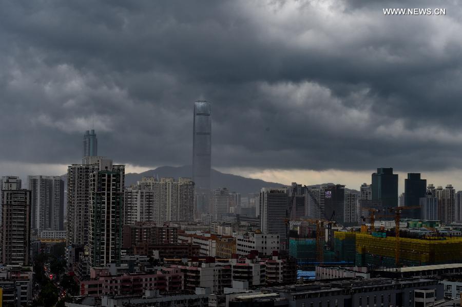 | Photo taken on May 11, 2015 shows dark clouds over the sky of Shenzhen, south China's Guangdong Province. A heavy rainstorm hit the city Monday. The local meteorological bureau issued red alert for rainstorms. (Xinhua/Mao Siqian) |