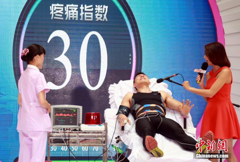 To celebrate the Mother’s Day, a special TV show “Labor Pain Challenge” was held in Nanchang, central China’s Jiangxi province on May 10, 2015. Nearly 20 “fathers-to-be” of different professions participated in the show. At last, a firefighter succeeded in challenging the pain index of 80 and won the game. The purpose of the show is to remind people of the greatness of mothers. (Chinanews/Jiang Tao)