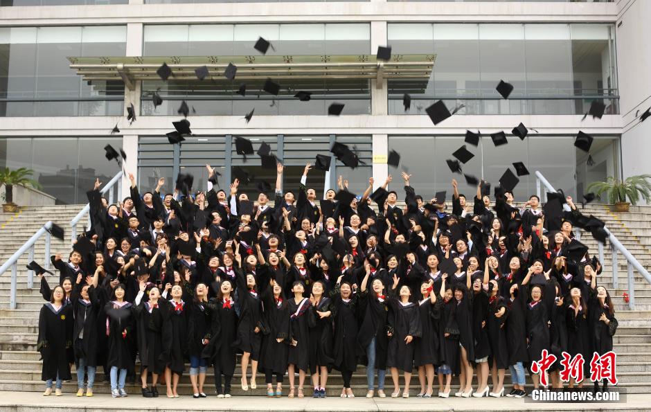 Graduates of Anhui University wear different kinds of costumes to take creative graduation photos on May 10. As the graduation season comes, graduates begin to take creative and stylish graduation photos to memorize their college life. (Chinanews/Han Suyuan)