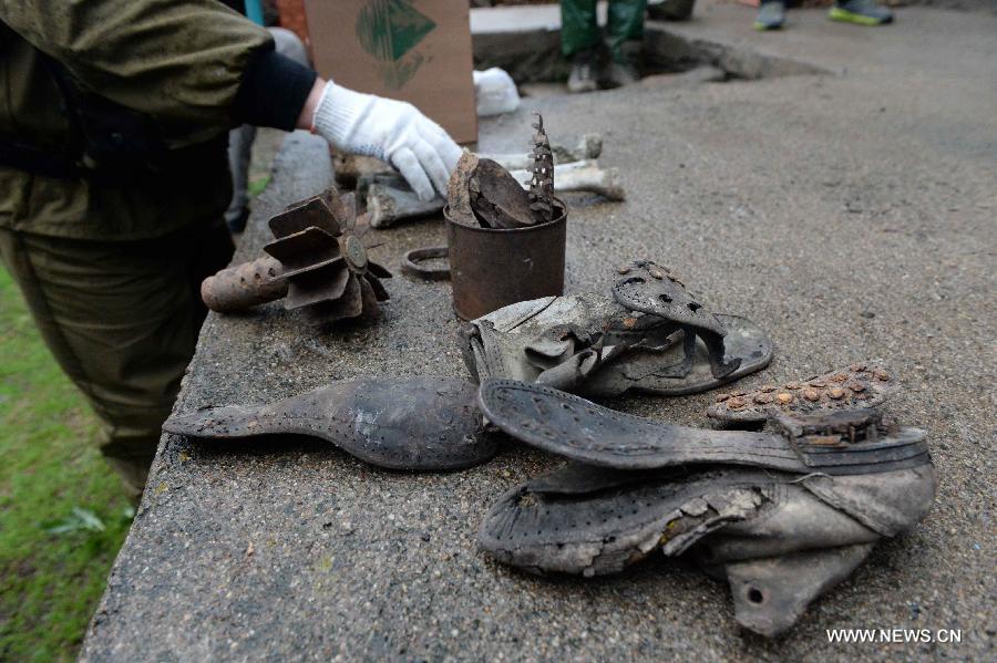 Russian team members demonstrate belongings of WWII Soviet Union soldiers on the Huoshao Mountain in Muling City, northeast China's Heilongjiang Province, May 12, 2015. A one-month-long China-Russia search began Tuesday to locate the remains of Soviet Union soldiers who died in China fighting Japanese invaders in 1945. A 17-member Russian team, along with a group of Chinese archaeologists, are involved in the dig. (Xinhua/Wang Kai)