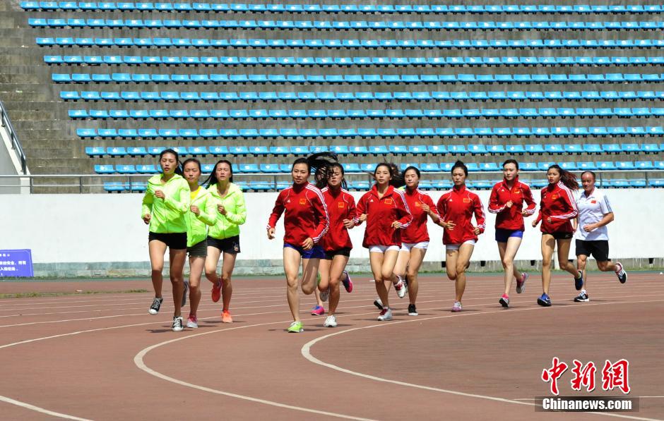 China women’s national fitness team does exercises under guidance at Chengdu University to prepare for the Asian Body Building & Fitness Championship on May 9, 2015. (Chinanews.com/ An Yuan)