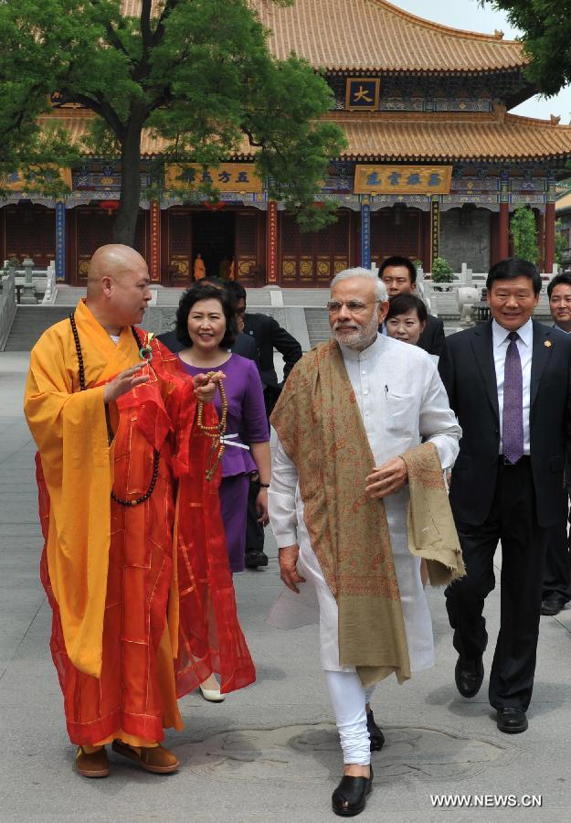 Indian Prime Minister Narendra Modi visits the Daxingshan Temple in Xi'an, capital of northwest China's Shaanxi Province, May 14, 2015. Modi arrived in Xi'an Thursday for an official visit to China. (Xinhua/Ding Haitao)