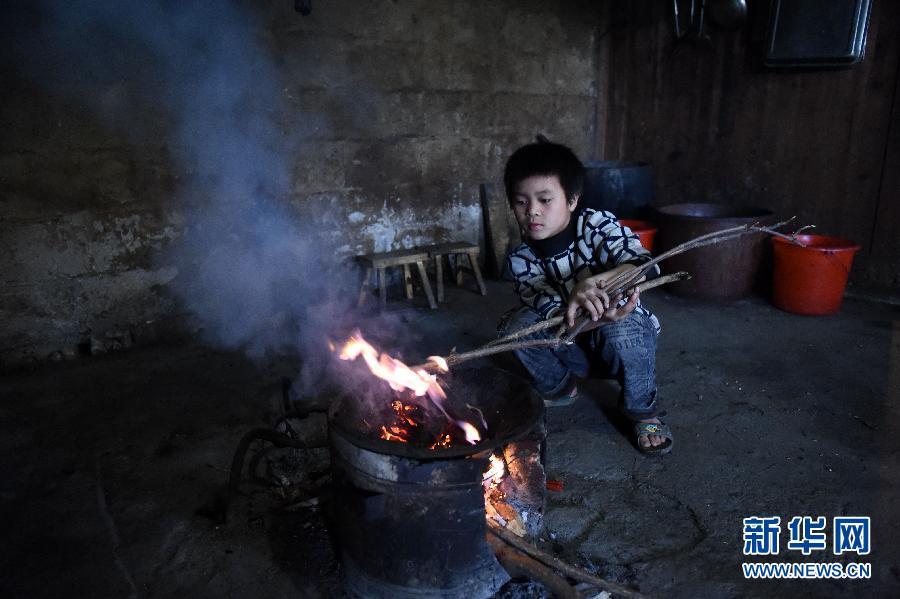 Yang Zhanyi builds a fire before preparing supper at home.