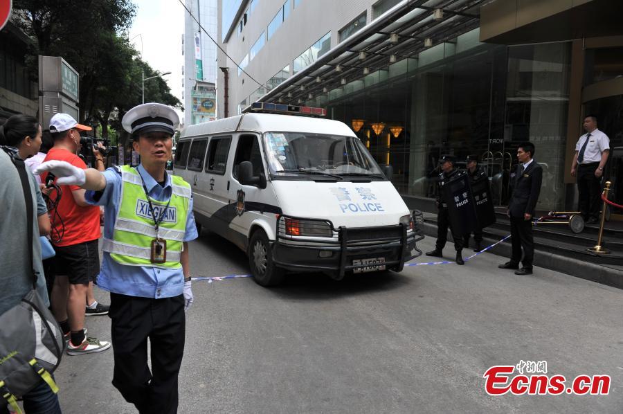 Police rescue a woman taken as hostage on a double-decker bus in Kunming, Southwest China’s Yunnan province, May 14, 2015. The suspect was detained and the hostage was not hurt after a 50-minute standoff. The suspect also hung banners saying "seeking legal redress for villagers in Henan province”. (Photo: China News Service/Ren Dong)