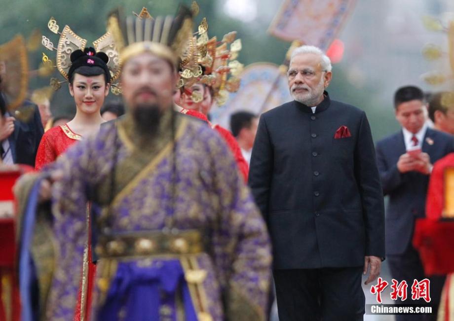 A welcoming ceremony is held for Indian Prime Minister Narendra Modi in Xi'an, capital city of northwest China's Shaanxi Province, May 14, 2015. (Xinhua/Huang Jingwen)