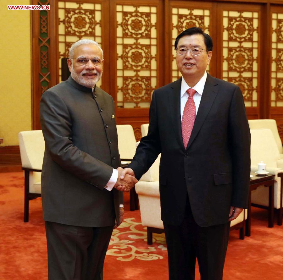 | Zhang Dejiang (R), chairman of the Standing Committee of China's National People's Congress (NPC), meets with Indian Prime Minister Narendra Modi in Beijing, capital of China, May 15, 2015. (Xinhua/Liu Weibing) |