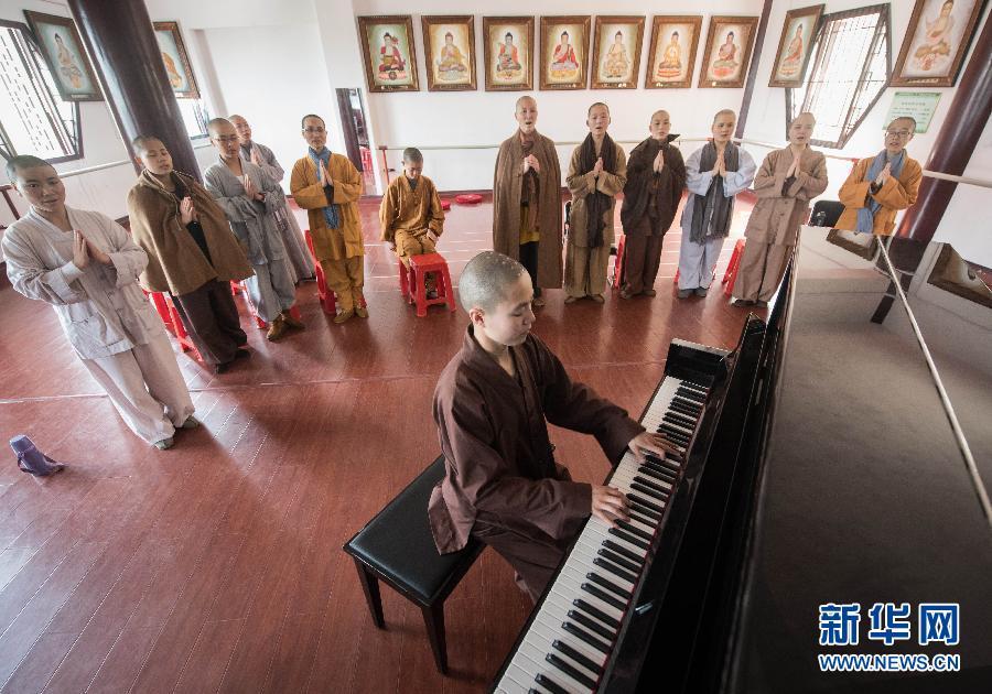 Located in central China’s Hubei province, Tiantai Temple is famous for its Buddhist music. Young Buddhist monks and nuns play beautiful music with violins, cellos, pianos and other instruments. Playing Buddhist music is their way of self-cultivation. In 2008, Tiantai Temple formed its own band – Guangxuan Art Troupe, which now has over 40 members. The band is often invited to perform music and spread Buddhism outside the temple. (Xinhua/Cheng Min)