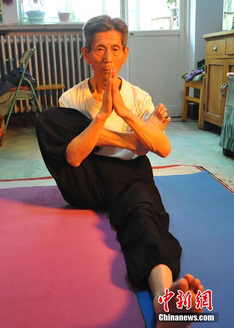Hou Zhenshan practices yoga at home. (CNS/Chen Xiaodong)