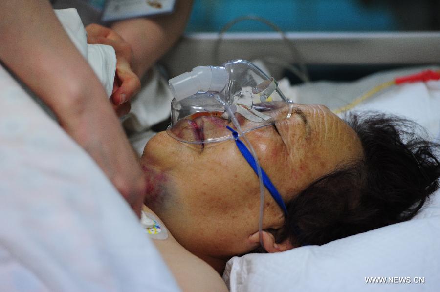 | An injured passenger receives treatment at a hospital in Xianyang City, northwest China's Shaanxi Province, May 15, 2015. The death toll of a road accident in Xianyang has increased to 35, local authorities said. The accident happened at 3:27 p.m., when a bus carrying 46 plunged 30 meters into a ravine in Chunhua county. (Xinhua/Ding Haitao) |
