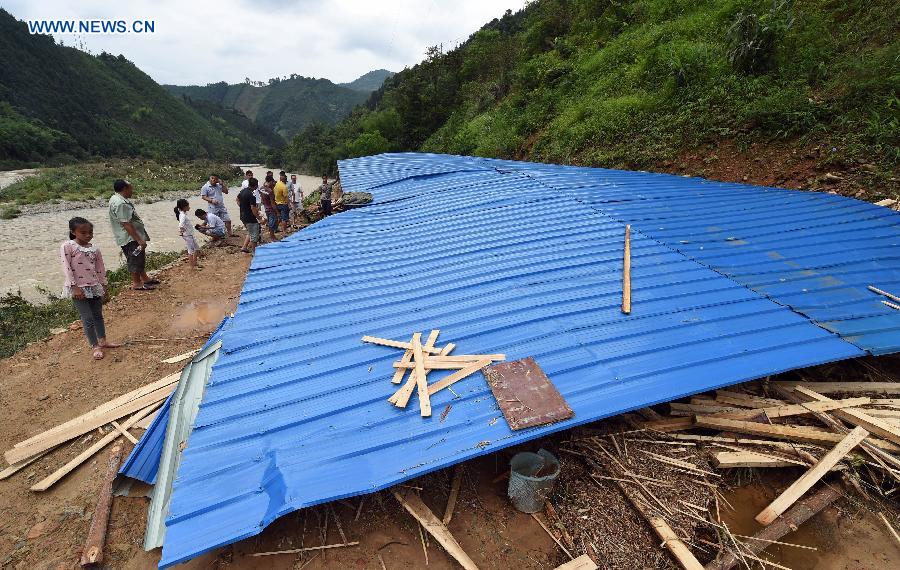 A timber mill is destroyed by flood at Sanfang Township of Rongshui County, south China's Guangxi Zhuang Autonomous Region, May 16, 2015. Heavy rains in the region have left at least four people dead and five missing. Local governments have evacuated more than 2,400 people. The rain also toppled 152 houses and damaged nearly 700, leading to surging waters in 12 main rivers of Guangxi and blocked traffic in remote regions. (Xinhua/Li Bin)