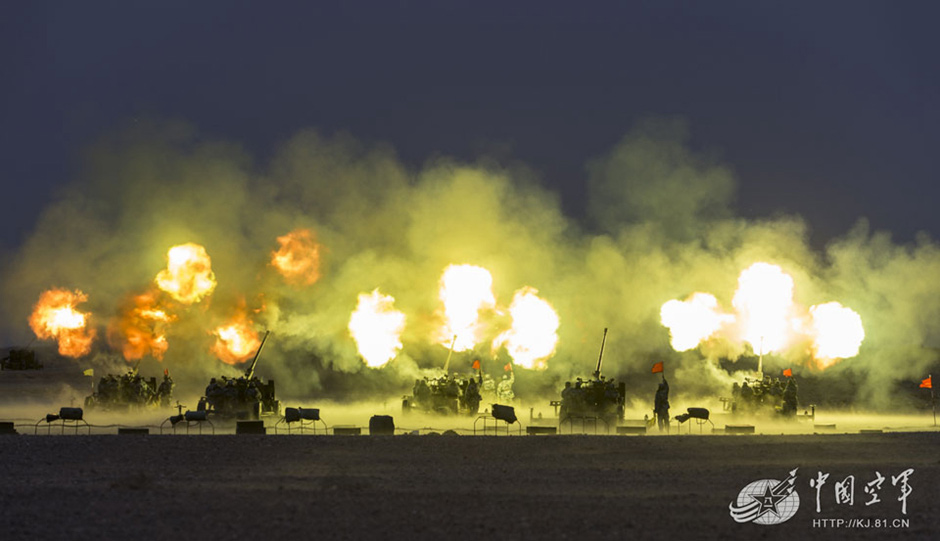 Antiaircraft guns fire a salvo at "enemies" in a drill. In early May 2015, an air defense regiment of Beijing Military Region successfully conducts a day and night maneuvering drill in the desert in northwest China. (Photo source: kj.81.cn)