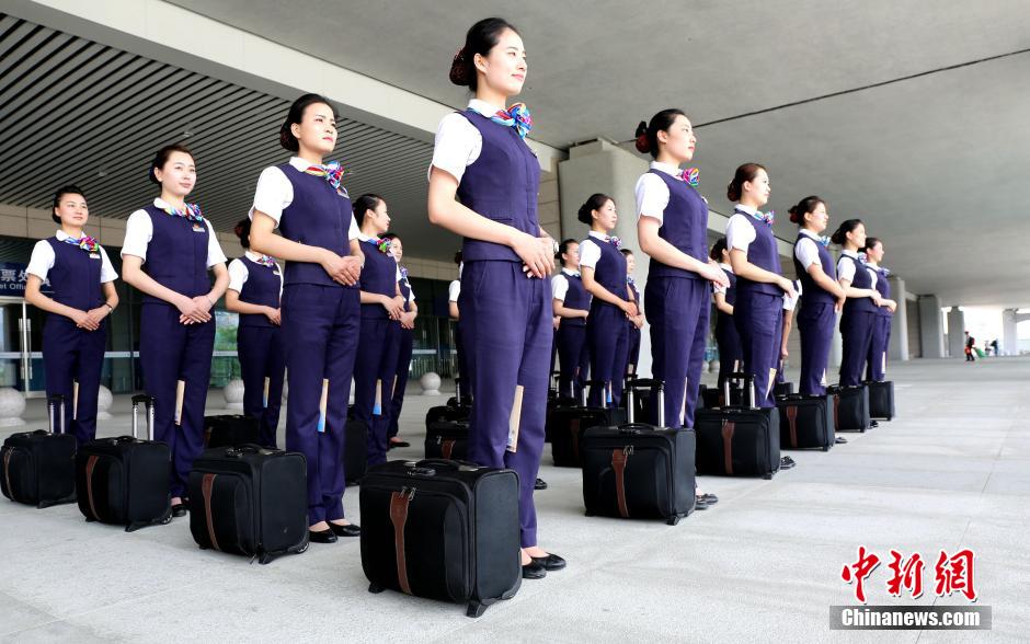 To celebrate the upcoming formal operation of Hefei-Fuzhou high speed rail (running 806 kilometers from Hefei of Anhui province to Fuzhou of Fujian province), 24 beautiful stewardesses who will serve on the trains debut in the north square of Fuzhou Railway Station, attracting much attention from passengers. (Chinanews/Li Yiming)