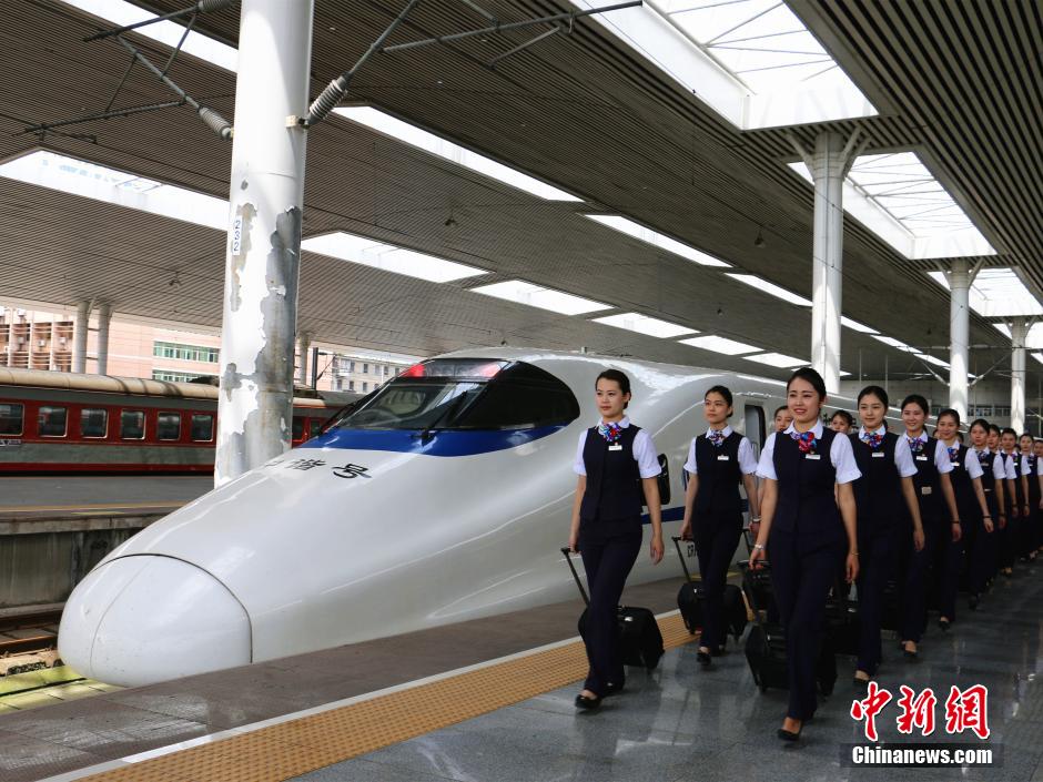 | To celebrate the upcoming formal operation of Hefei-Fuzhou high speed rail (running 806 kilometers from Hefei of Anhui province to Fuzhou of Fujian province), 24 beautiful stewardesses who will serve on the trains debut in the north square of Fuzhou Railway Station, attracting much attention from passengers. (Chinanews/Li Yiming) |