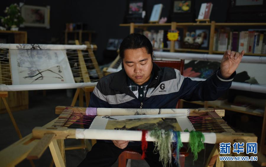Jiang Tongwan does embroidery at his own shop, March 27, 2015. (Xinhuanet/Li Ga)