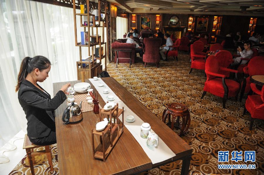 Xiao Xiaoyan performs tea art in a five-star hotel, May 13, 2015. (Xinhuanet/Ou Dongqu)
