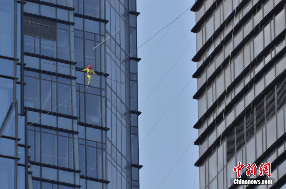 | Chinese tightrope walker Aisikaier successfully sets a new world record for tightrope walking in Kunming, southwest China’s Yunnan province on May 16, 2015. With eyes covered, Aisikaier walked backwards on a tightrope 150 meters above the ground between the twin towers of Kunming Wanda Plaza. It took him 6 minutes and 40 seconds to finish the journey and then he walked back and forth several times and performed some stunts on the tightrope. (Chinanews/Li Weihua) |