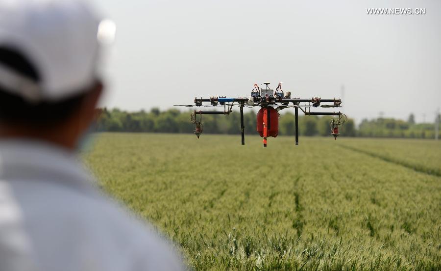 A drone flies over a wheat field to spray insecticide at Wenjiazhuang Village in Shijiazhuang, north China's Hebei Province, May 19, 2015. One insecticide spraying drones can cover 15 to 20 hectres of wheat field in eight hours, significantly saving costs compared with traditional methods. (Xinhua/Wang Xiao)