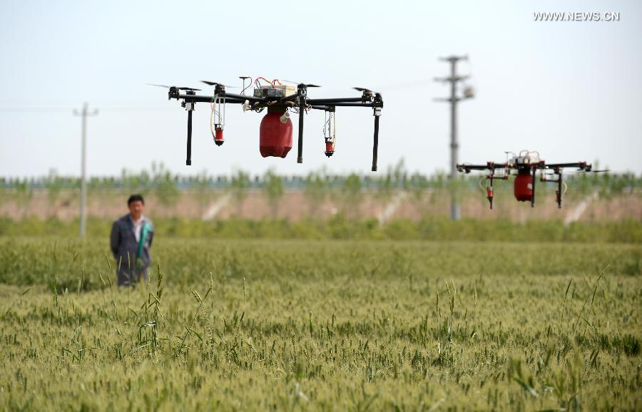Drones fly over a wheat field to spray insecticide at the Wenjiazhuang Village in Shijiazhuang, north China's Hebei Province, May 19, 2015. One insecticide spraying drones can cover 15 to 20 hectres of wheat field in eight hours, significantly saving costs compared with traditional methods. (Xinhua/Wang Xiao)