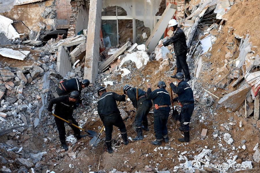 | Rescuers search for the missing in the rubble at Yimin New Village of Tuban Town in Linxian County, north China's Shanxi Province, May 20, 2015. Four people were dead and four others missing in a landslide of a loess hill burst burying four farmers' houses Tuesday evening. (Xinhua/Zhan Yan) |