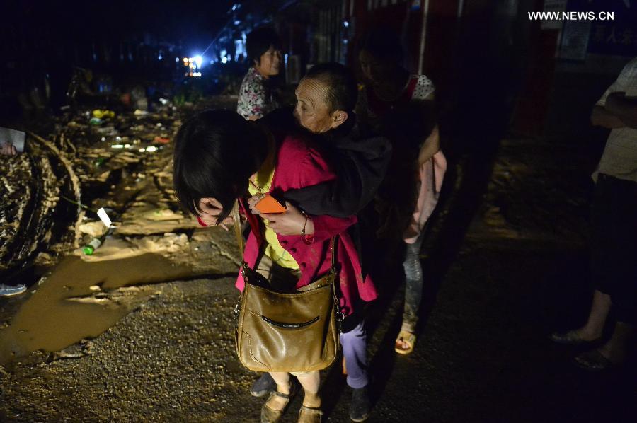 Residents evacuate in Hengjiang Town of Shicheng County, east China's Jiangxi Province, May 19, 2015. Seven people have been killed in landslides and house collapses caused by torrential rain in Jiangxi since Monday. The downpour has flooded 13,810 hectares of farmland, and destroyed hundreds of homes, forcing almost 10,000 to leave their homes. (Xinhua/Zhou Mi)
