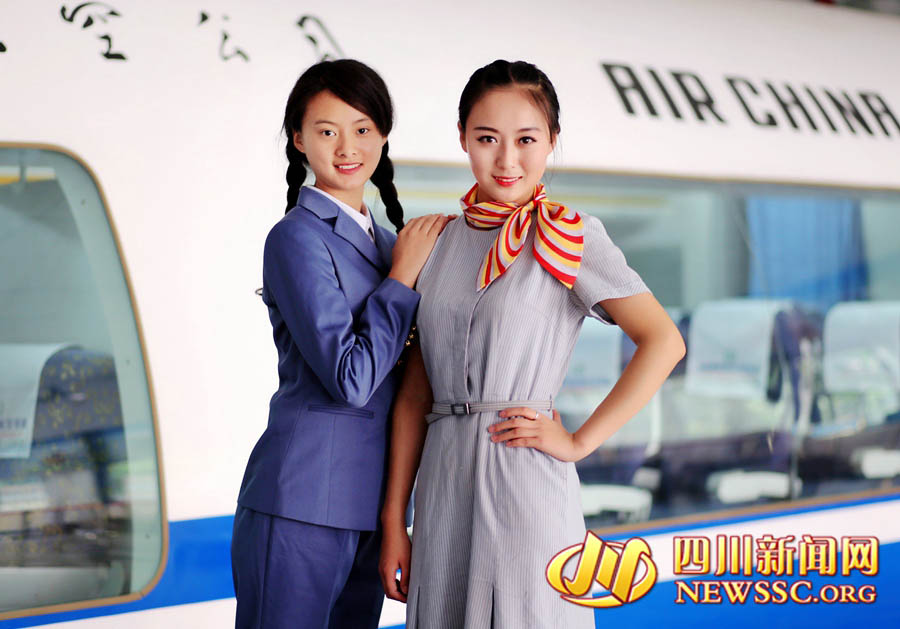 Students present the air stewardess uniforms of the past in Chengdu East Star Airlines Travel College, southwest China's Sichuan province, May 12, 2015. You can see the fashion changes through the years when you look at these uniforms. (Photo/newssc.org)