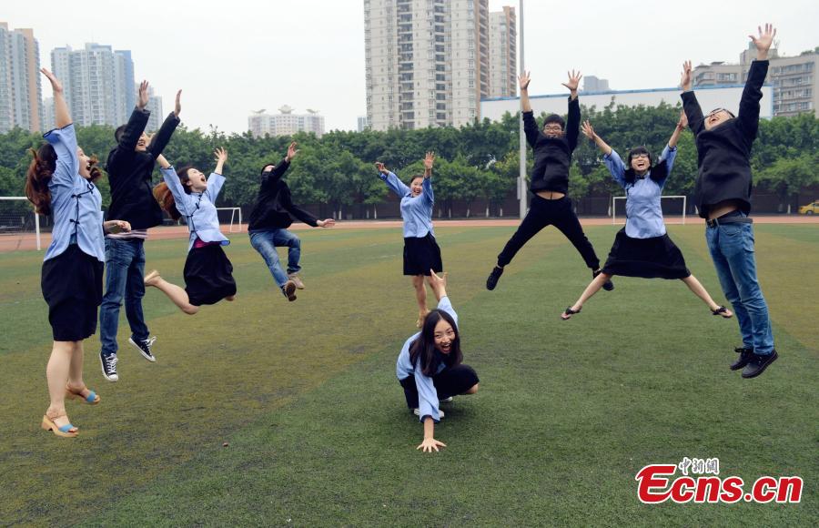 Graduates dress in Chinese costumes popular in early last century and pose for photos at a university in Southwest China’s Chongqing municipality. (Photo: China News Service/Chen Qiuxing)