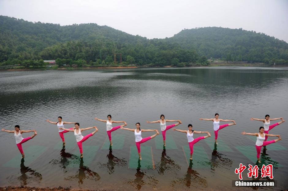 Several beauties perform Yoga on water in Shiyan Lake in Changsha, central China's Hunan province on May 20, 2015. (CNS/Yang Huafeng)