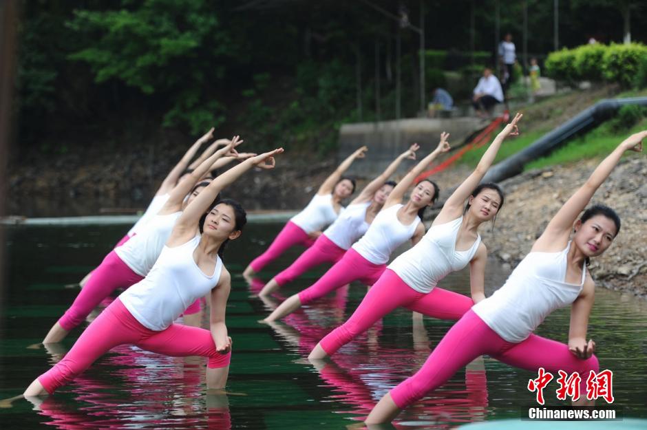 Several beauties perform Yoga on water in Shiyan Lake in Changsha, central China's Hunan province on May 20, 2015. (CNS/Yang Huafeng)