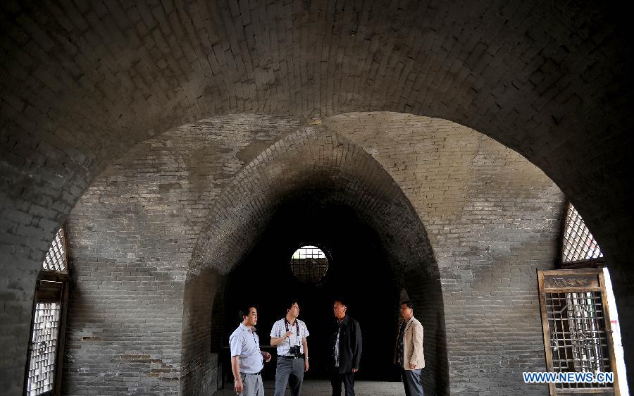 | People visit the site of a meeting hall in Anding Town of Zichang County, northwest China's Shaanxi Province, May 20, 2015. The 1,600-year-old Anding Town has well-preserved Zhongshan Mountain Grottoes and other architectures of ancient times. (Xinhua/Tao Ming) |
