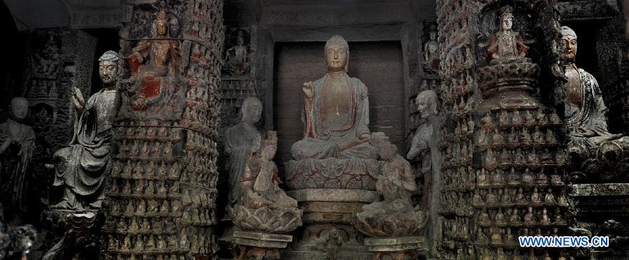 Photo taken on May 20, 2015 shows Buddha statues in a grotto in Anding Town of Zichang County, northwest China's Shaanxi Province. The 1,600-year-old Anding Town has well-preserved Zhongshan Mountain Grottoes and other architectures of ancient times. (Xinhua/Tao Ming)