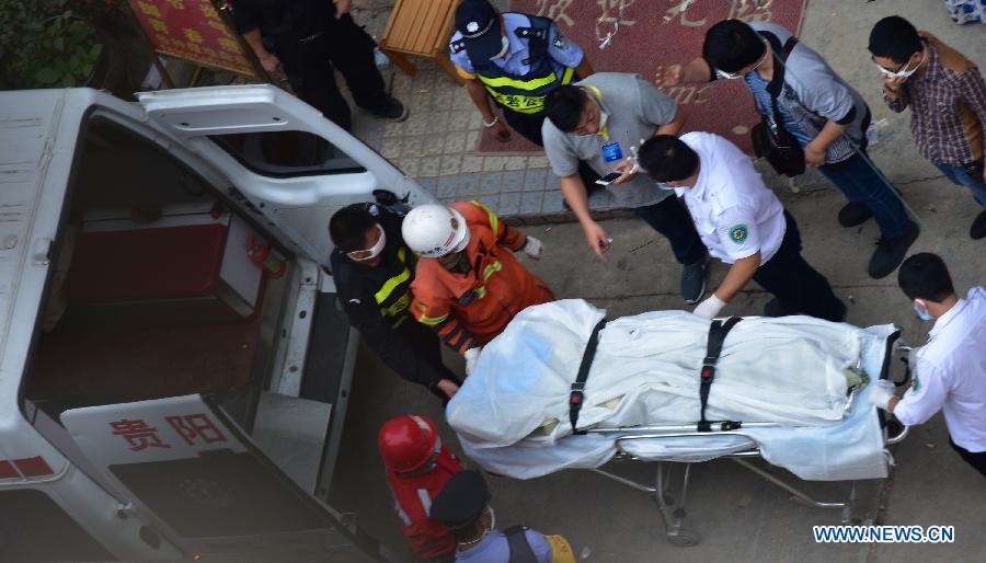 Rescuers carry a victim's body in Guiyang, capital of southwest China's Guizhou Province, May 21, 2015. Five bodies were found in the rubble of a collapsed building in central Guiyang Thursday. The accident happened on Wednesday, when the nine-story building with 114 residents living in it fell down. (Xinhua/Liu Xu)