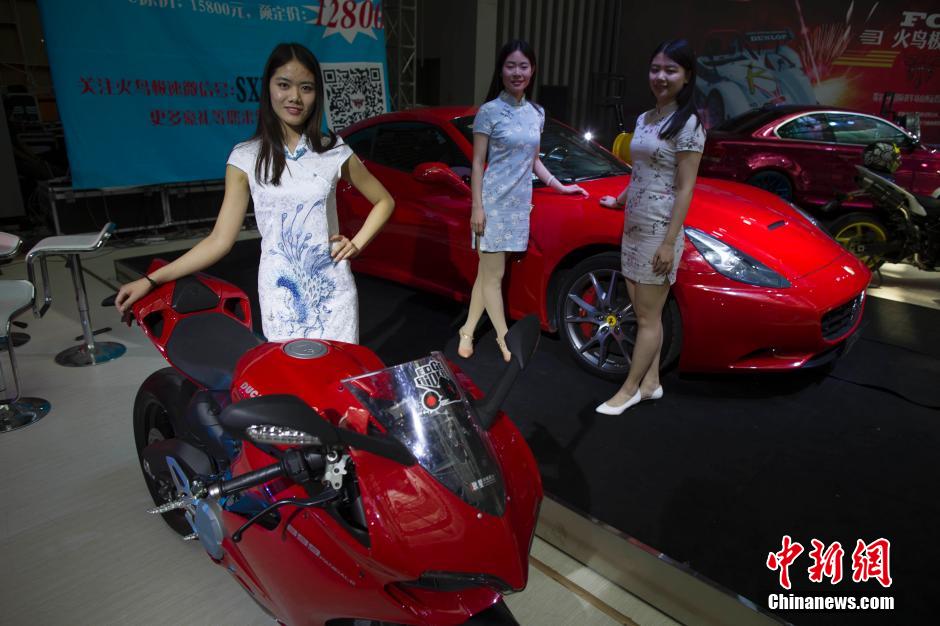 Upon graduation, a group of university students dressed in cheongsams pose for photos at an auto show in Taiyuan, north China's Shanxi Province.(Chinanews.com/Zhang Yun)