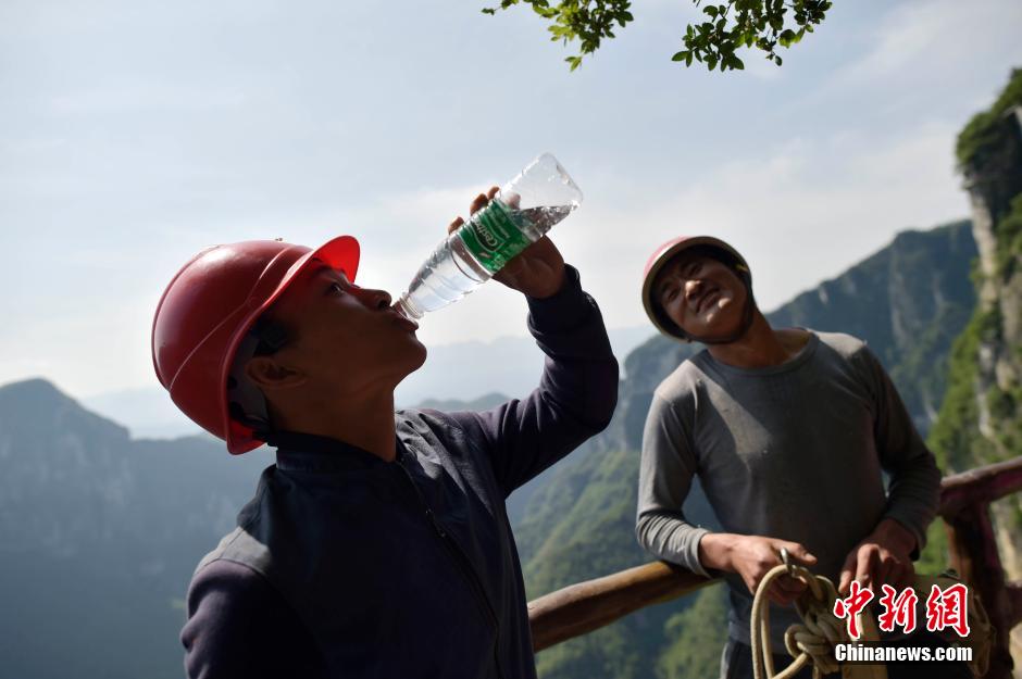 Litter pickers drink water during a break at work.(Photo/Chinanews.com)
