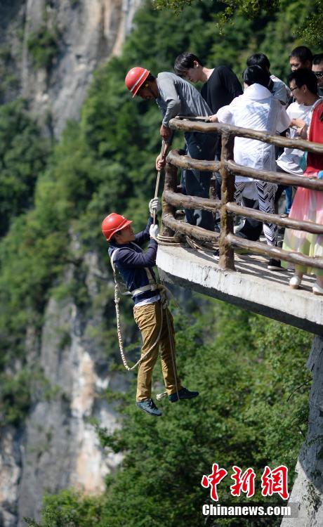 With the help of co-workers, the litter picker abseil down the cliff.(Photo/Chinanews.com)